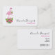 Business cards with a tropical themed Christmas flamingo wearing a pink santa hat. Underneath its feet is a candy cane bouquet with pretty tropical flowers and pink berries. A sprig of holly on its chest.