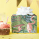 Pink flamingoes wade in a lush tropical lagoon and tend to their chicks in this colourful pattern created in the style of mid century paint by number kits. Fans of mid century design and kitsch will love seeing their gifts wrapped in this fun paper filled with these exotic birds. The main colours of this design are pink, blue and shades of green.