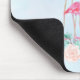 A personalized mousepad with a name and initial separated by a thin blue line divider. Designed with an illustration of a momma and baby pink flamingo standing on a bed of floral succulent flowers with green palm trees swaying in the back. Tropical and pretty. The background is a summery light blue watercolor with hints of purple.