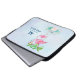 A laptop sleeve personalize with a name and initial. Designed with an illustration of a momma and baby pink flamingo standing on a bed of floral succulent flowers with green palm trees swaying in the back. Tropical and pretty. The background is a summery light blue watercolor with hints of purple.