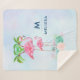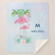 Personalized sherpa blanket with a name and initial. Designed with an illustration of a momma and baby pink flamingo standing on a bed of floral succulent flowers with green palm trees swaying in the back. Tropical and pretty. The background is a summery light blue watercolor with hints of purple.