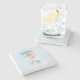 Stone coaster with an illustration of a momma and baby pink flamingo standing on a bed of floral succulent flowers with green palm trees swaying in the back.