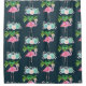 A shower curtain with an illustration of a pink flamingo standing on a bed of floral succulent flowers with green palm trees swaying in the back. Tropical and pretty.