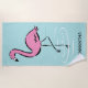 This beach towel features a pink flamingo wading in water with a name below for you to personalize. Blue background colour may be changed by customizing.