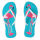 Fun personalized flip flops, with a turquoise blue foot bed and whimsical cartoon style graphics of a big pink flamingo. Personalize the white name on the left foot, for yourself or as a cute gift idea.