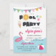 Fun pool party invitation for a kid's birthday with a pink flamingo swim ring and a beach ball floating in the water. A shining sun has replaced one of the o's in pool and the text is cornered by an ice cream cone and three starfish beneath a colourful bunting banner.