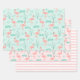 Pink flamingo images are the feature on two of the sheets in this trio of all occasion wrapping paper sheets. Along with the flamingos are teal leaves and lily pads. One paper has a light teal background, and one has a light pink background. The third paper has matching pink and white stripes. Pretty for any occasion!
