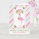 A whimsical tropical christmas greeting card - folded card style.. A pink and green candy cane striped background. Layered over top is a fancy pink flamingo with a leg raised up. Wearing a pink santa hat and some seasonal holly. Holly with berries also decorate the corners. A floral bouquet above her head with candy canes crossed together.
