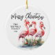 Célébrez la saison avec cet ornement de Noël festif et de plage, parfait pour une fête côtière. En haut, "Joyeux Noël" s'affiche dans un joyeux mélange de polices de script et de serif. Sur le côté gauche, il y a de l’espace pour personnaliser avec un nom et une date, ce qui en fait un cadeau ou un bon souvenir. En bas à droite, trois flamants roses se tiennent dans le sable, certains portant des chapeaux de Père Noël, avec de l'herbe et des ornements à leurs pieds, ajoutant une touche ludique et tropicale. Le cadre décontracté de la plage et son aquarelle douce lui donnent une ambiance amusante et chaude. La même conception apparaît de part et d'autre de l'ornement. Tous les textes, polices et couleurs peuvent être customisés pour correspondre à votre style de vacances. Un complément amusant à n'importe quel arbre de Noël, surtout pour ceux qui aiment les flamants roses, le soleil et le charme côtier.