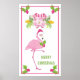 A whimsical tropical christmas poster. A fancy pink flamingo with a leg raised up. Wearing a pink santa hat and some seasonal decorative holly. Pink and white candy canes crossed together to form a heart. Text says Merry Christmas in green lettering.