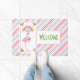 A whimsical tropical christmas welcome doormat. A fancy pink flamingo with a leg raised up. Wearing a pink santa hat and some seasonal holly. Holly with berries also decorate the corners. A floral bouquet with candy canes above her head. A pink and green candy cane striped background.