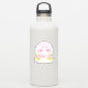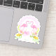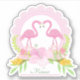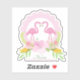 This pretty contour sticker features two pink flamingos facing each other beak to beak. The birds are at the centre of a pink scallop circle frame, with a pink hibiscus floral arrangement at the bottom. Your name is in green below the floral image. Many decorative uses; it's up to your imagination!
