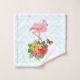 Towel set with a cute digital illustration featuring a pink flamingo with one leg raised. Standing on a bouquet of tropical hibiscus flowers and leaves. A pretty butterfly is hovering around the flowers. A light green and white chevron pattern in the background.