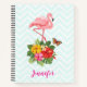 Spiral notebook with a cute digital illustration featuring a pink flamingo with one leg raised. Standing on a bouquet of tropical hibiscus flowers and leaves. A pretty butterfly is hovering around the flowers. A light green and white chevron pattern in the background.