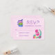 A flat RSVP response card with a pink watercolor background. A cute flamingo illustration with watermelons and pineapple. Also a trio of macarons wrapped with a bow.