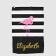 A pink flamingo appears on black and white stripes. At the bottom, this golf towel can be personalized with the recipient's name in faux gold script.