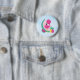 A button with a cute illustration of a pink flamingo with some watermelons and pineapples. Pink and green colour scheme. Summery and tropical.