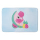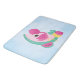 A bath mat with a cute illustration of a pink flamingo with some watermelons and pineapples. Pink and green colour scheme. Summery and tropical. The background is a light blue watercolor image.