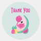 Thank you sticker with a cute illustration of a pink flamingo with some watermelons and pineapples. Pink and green colour scheme. Summery and tropical. The background is a pale green colour with white polka dots. Thank you written in an art deco font.