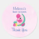 Baby shower (or other event) thank you stickers. Designed with a cute illustration of a pink flamingo with watermelons and pineapples. Summery and tropical.