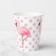 Whimsical retro style paper cups, with graphics of pink fluffy looking flamingos on a pink and white polka dot background. Matching paper napkins and plates are available.