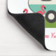 A mousepad featuring an illustration of a retro trailer home with turquoise stripe and awning and three pink plastic flamingos in the yard. Customizable text says "Home Is Where You Put Your Flamingos!"