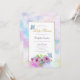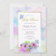 A blue and pink floral baby shower invitation featuring a gold and pastel painted watercolor border.