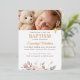 Share your baby's photo with our baptism invitation template, created with pink florals at the bottom and a tiny foil cross at the top under photo. Event and name templates are also foil templates.