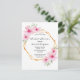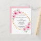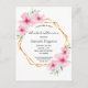 Une élégante invitation de mariée tropicale estivale. Avec un cadre géométrique en faux or décoré d'hibiscus rose pâle, fleurissent des fleurs tropicales avec un peu de verdure. Couleur arrière - plan blanche. Le texte : Fête des mariées et le nom de la mariée sont écrits avec un script moderne de style manuscrit. Texte noir. Dos : couleur arrière - plan rose. Conseil : Si vous ne voulez pas qu'il ressemble à une carte postale, cliquez sur customiser, allez à l'arrière et retirez le séparateur et le timbre postal.