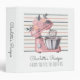 A cute illustrated recipe binder featuring a pink mixer adorned with a floral on a striped background. The tagline reads: from meats to sweets. A binder for a recipe collection to use for anything from main meals to desserts and everything else.