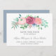 Romantic save the dates featuring a flower garland consisting of pastel pink and mauve roses with your wedding details below. The backside is a matching shade of dusty blue and may be changed to any colour you wish. This elegant floral design is perfect for a wedding in the spring.