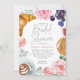 Invite guests for an elegant bridal shower brunch with these beautiful watercolor invitations. Design features your celebration details in modern lettering, surrounded by illustrations of breakfast pastries, croissants, macarons, coffee, and pink peony flowers.