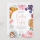 Invite guests for an elegant bridal shower brunch with these beautiful watercolor invitations. Design features your celebration details in modern lettering, surrounded by illustrations of breakfast pastries, croissants, macarons, coffee, and pink peony flowers.