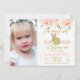 Photo some sweet bunny first birthday invitation for a baby girl featuring some lovely watercolor pink floral arrangements. The design also includes a faux gold foil calligraphy heading and little bunny. Sure to set the scene for a pink and gold some bunny themed first birthday party for a baby girl. Same bunny invitation is also available with a faux gold glitter back.