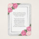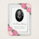 Elegant pink and silver floral memory cards/funeral prayer cards featuring a photo frame adorned with blush pink roses against a botanical patterned background.