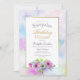 A blue and pink floral surprise birthday dinner party invitation featuring a gold and pastel painted watercolor border.