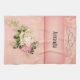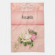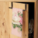 A kitchen towel with a floral rose bouquet with white and pink flowers. A faux diamond tiara. Background is pink with a floral pattern. Pretty and elegant design.