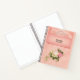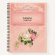 A personalized spiral notebook with a floral rose bouquet with white and pink flowers. A faux diamond tiara. Background is pink with a floral pattern. Pretty and elegant design.
