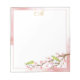 Elegant with beautiful cherry blossoms flowers on one side and pink and gold framed notepad with a customized first name or last name monogram on the top portion of the notepad with white sheets.