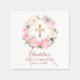 A white background, decorated with watercolored pink and ivory flowers in a wreath and a golden cross. A pink bow. Personalize and add the name and date.