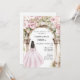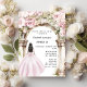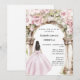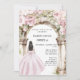 A large marble arch decorated with pink florals. A girl with a light pink dress. Personalize and add a name and details.
