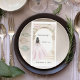 A large marble arch decorated with pink florals. A girl with a soft blush pink dress. Personalize and add a text, name, date.