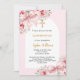 A white arch frame and light pink background. Decorated with pink flowers and pin bows. A golden cross. Personalize and add a name and details.