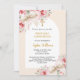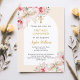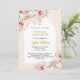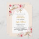 A white arch frame and a soft beige, peach coloured background. Decorated with pink flowers and pin bows. A golden cross. Personalize and add a name and details.