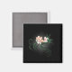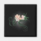 A magnet with an illustration of some delicate pink blossoming flowers with green swirlies and leaves on a black background with some light grey shading around the flowers to accentuate and illuminate.