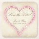 This wedding Save the Date Coaster has a pink flower petal heart design on a vintage paper background. All elements are fully customizable, including the background image and text.