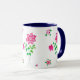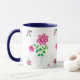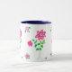 A pretty white mug with dark blue lip and handle and a pink and green floral design that mimics applique or quilting, from a handpainted paper collage by Judy Adamson.