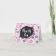 A thank you note card with a cute floral pattern. Composed of pink and purple irregular shaped flowers in a retro sixties groovy style. Faint faded little blue hearts, pepper the background on a pale blue backdrop. A black hand drawn circle is layered over top, with Thank You wirtten in a white trendy font.