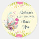 Thank you sticker for a baby shower or other occasion with a personalized name. Designed with pink and green floral elements along the border. Illustrated with a cute watercolor egg sitting inside a brown wicker basket. The basket is decorated with ribbons, bows, flowers and little hearts too. A pink flamingo and white bunny rabbit standing nearby. Yellow background.