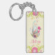 Personalized acrylic keychain decorated with pink and green floral elements. Illustrated with a cute watercolor egg sitting inside a brown wicker basket. The basket is decorated with ribbons, bows, flowers and little hearts too. A pink flamingo and white bunny rabbit standing nearby.